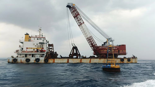 pengangkatan bangkai KMP Tunu Pratama Jaya menggunakan kapal tongkang bercakar